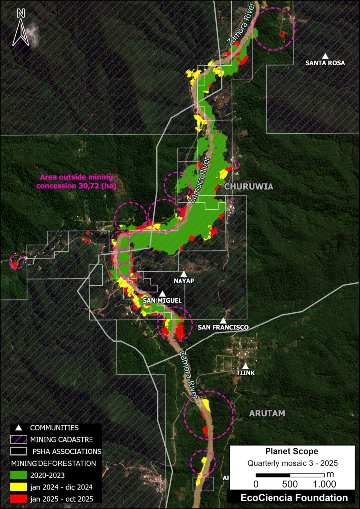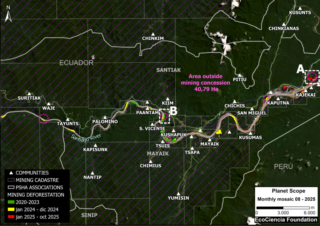 Base Map 1 shows the locations of recent confirmed mining-related deforestation using detections from the latest quarterly update of Amazon Mining Watch across the Ecuadorian Amazon, in relation to the cumulative mining impact area (2018-2024). It can be seen that several Indigenous territories converge in the analysis area (purple circles).