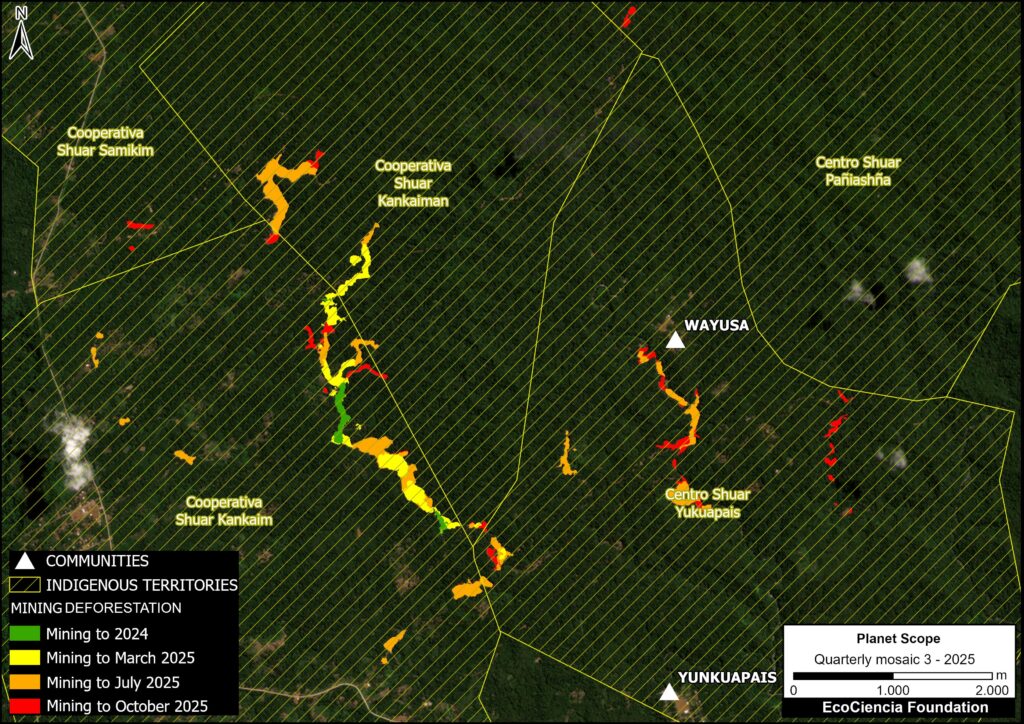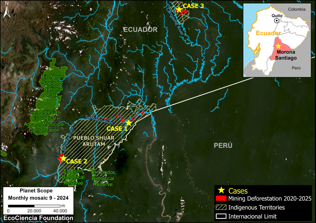 Case 3 focuses on mining in the north of the province; here, illicit mining has been identified within several Shuar territories (Samikim, Kankaiman, KainKaim, Yukuapais, and Pañiashña).