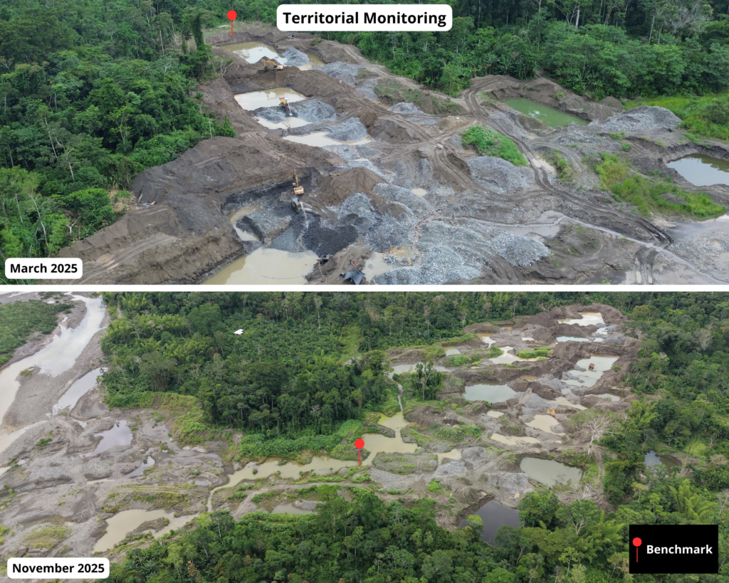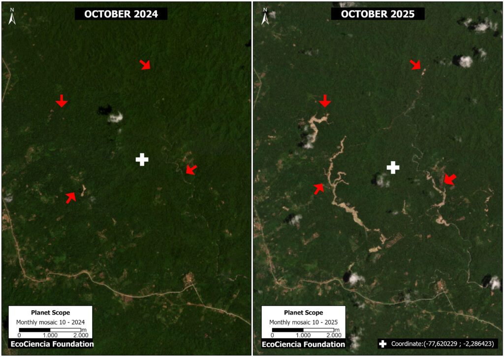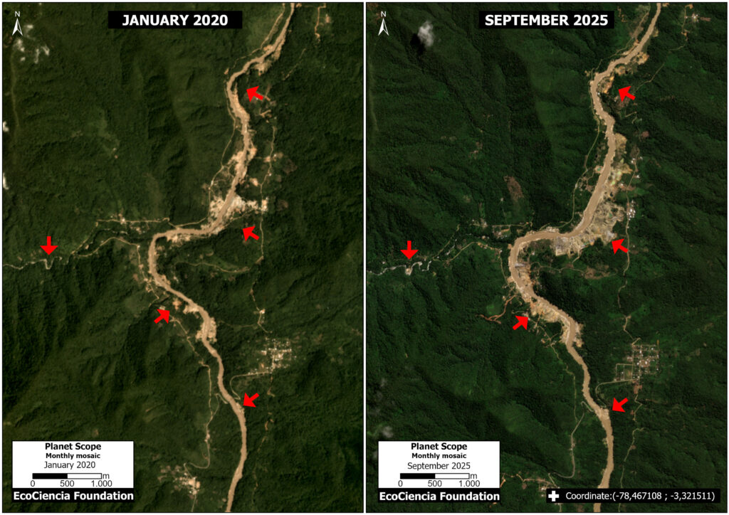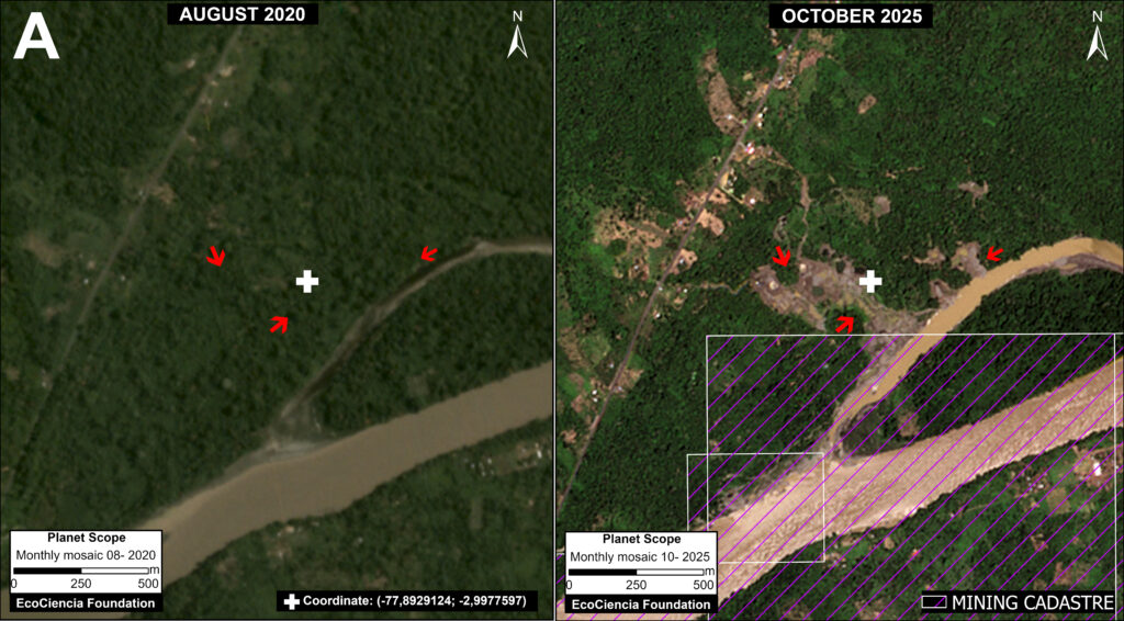 Panel 3 illustrates the situation in Area B, comparing mining deforestation (and impact to the river) between August 2020 (left panel) and September 2025 (right panel). Of this total forest loss, we confirmed that 9 hectares (22 acres) were located outside of authorized concessions and therefore likely illegal.